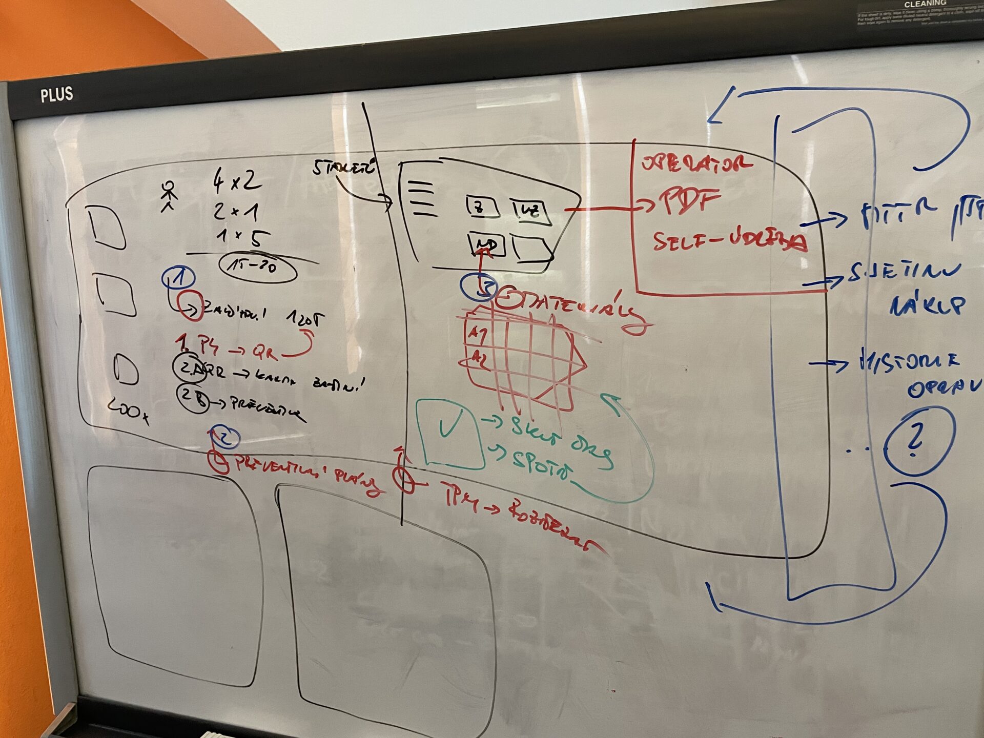 Původní zadání začínalo schématem na tabuli. My jsme jej přenesli do digitální formy. Pracující v několika továrnách po světě podle stejných pravidel, ve stejné verzi systému.